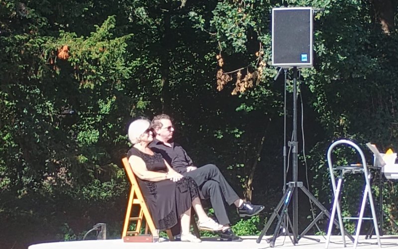 Er was sprake van een z.g. zondagochtend concert hetgeen betekende dat we zouden spelen van 11.00-12.15 uur zonder pauze. Goed geregeld met een geluidsman, aangeleverde stoelen en facilitaire ondersteuning. De uitbundige zon zorgde ervoor dat de publieke opkomst voor dit tijdstip van de dag uitzonderlijk hoog is geweest. Ik schat zo’n 200 toeschouwers.